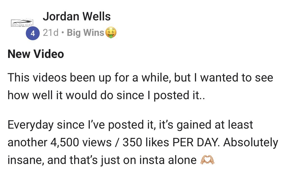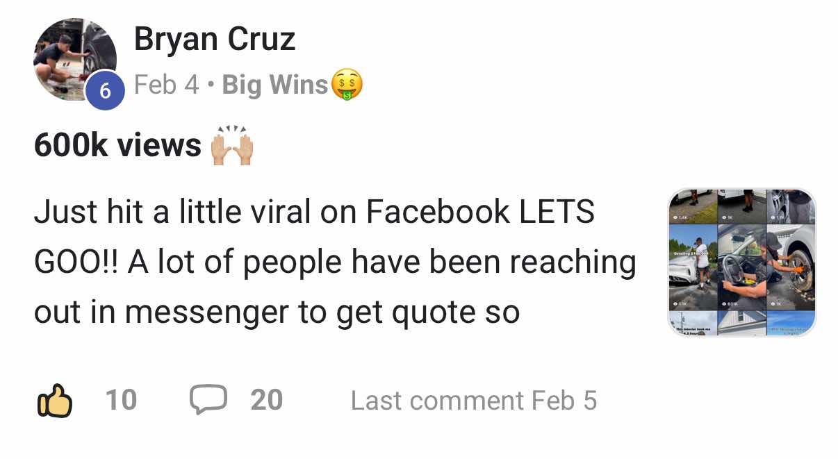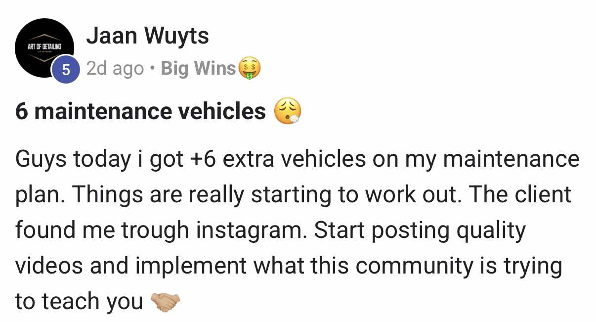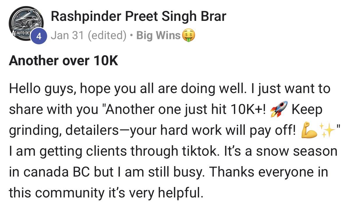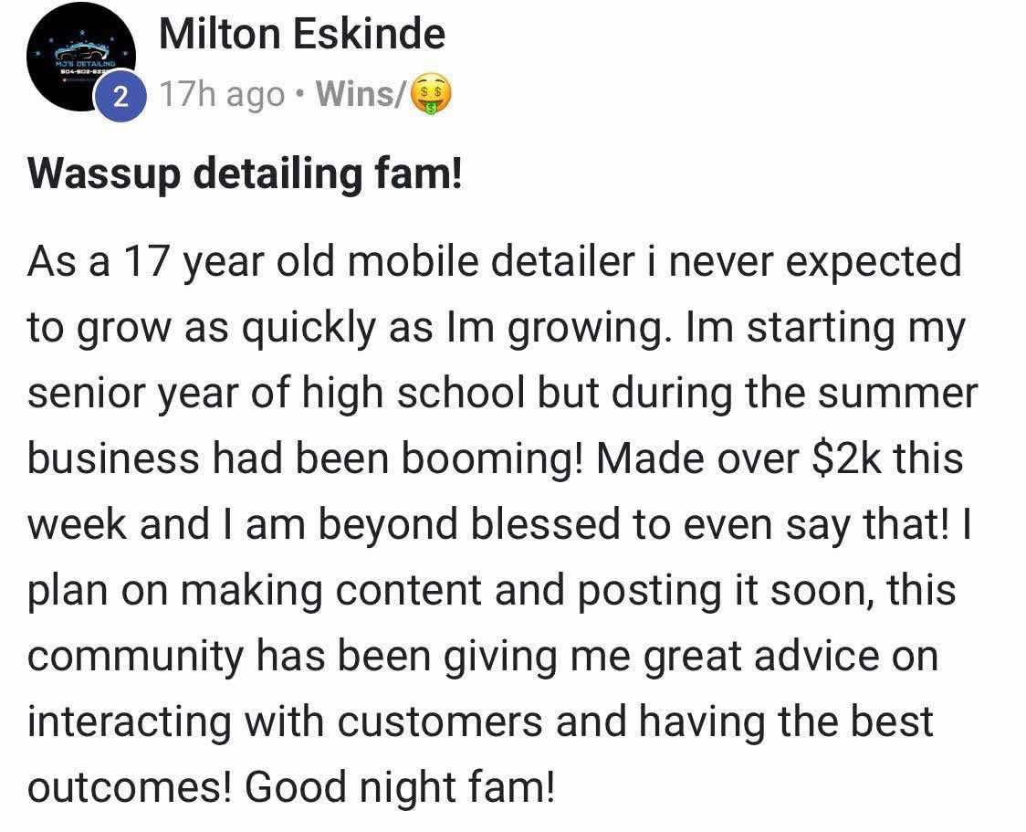 "After 2 months focusing on content creation my business just took off. A lot of people started reaching out and they even paid me extra to go and detail their car, it's been crazy."